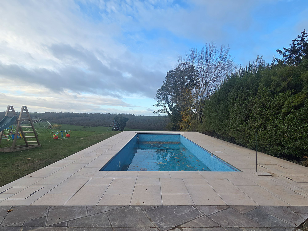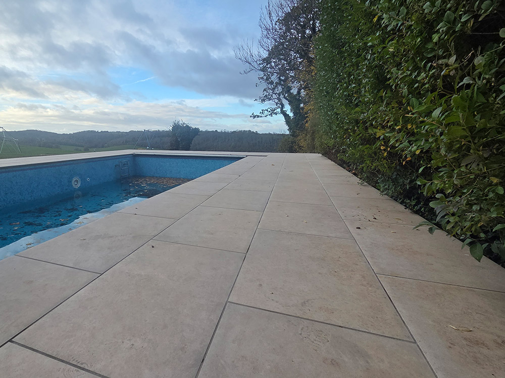 The pool has been fully retiled, and new porcelain slabs from London Stone (900×600mm) were installed around the perimeter. The updated paving complements the newly finished pool and enhances the overall aesthetic of the property.